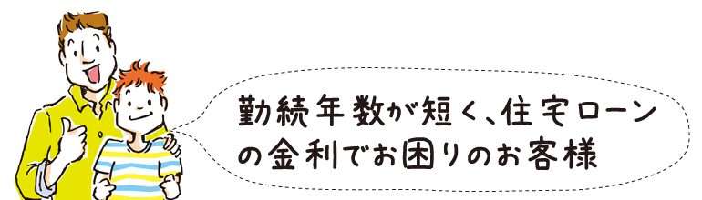 転職してからまだ6カ月しかたっていないA様は、勤続年数が短いために高い金利でしか住宅ローンの融資を受けることができず、 悩まれていました。しかし、転職の理由が外部からのヘッドハンティングであったため、その経緯を銀行に話し、 会社側に給与支払予定の作成と奥様に保証人となっていただいたことで、希望していた住宅費用を借り入れることができました。