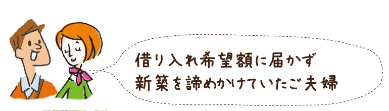 小さな会社にお勤めのG様は、新築一戸建ての購入費用のために2,500万円の借り入れが必要でした。 ご自分で銀行に融資の相談をしてみましたが住宅ローンが通らず、マイホームの夢を諦めかけていました。 そこで、お勤め先の取引銀行に相談することをご提案。取引銀行から、お勤めの会社の状況を確認してもらったところ、 優良取引先だったことがわかり、新築一戸建ての購入費用にあたる希望額の満額を借り入れすることができました。